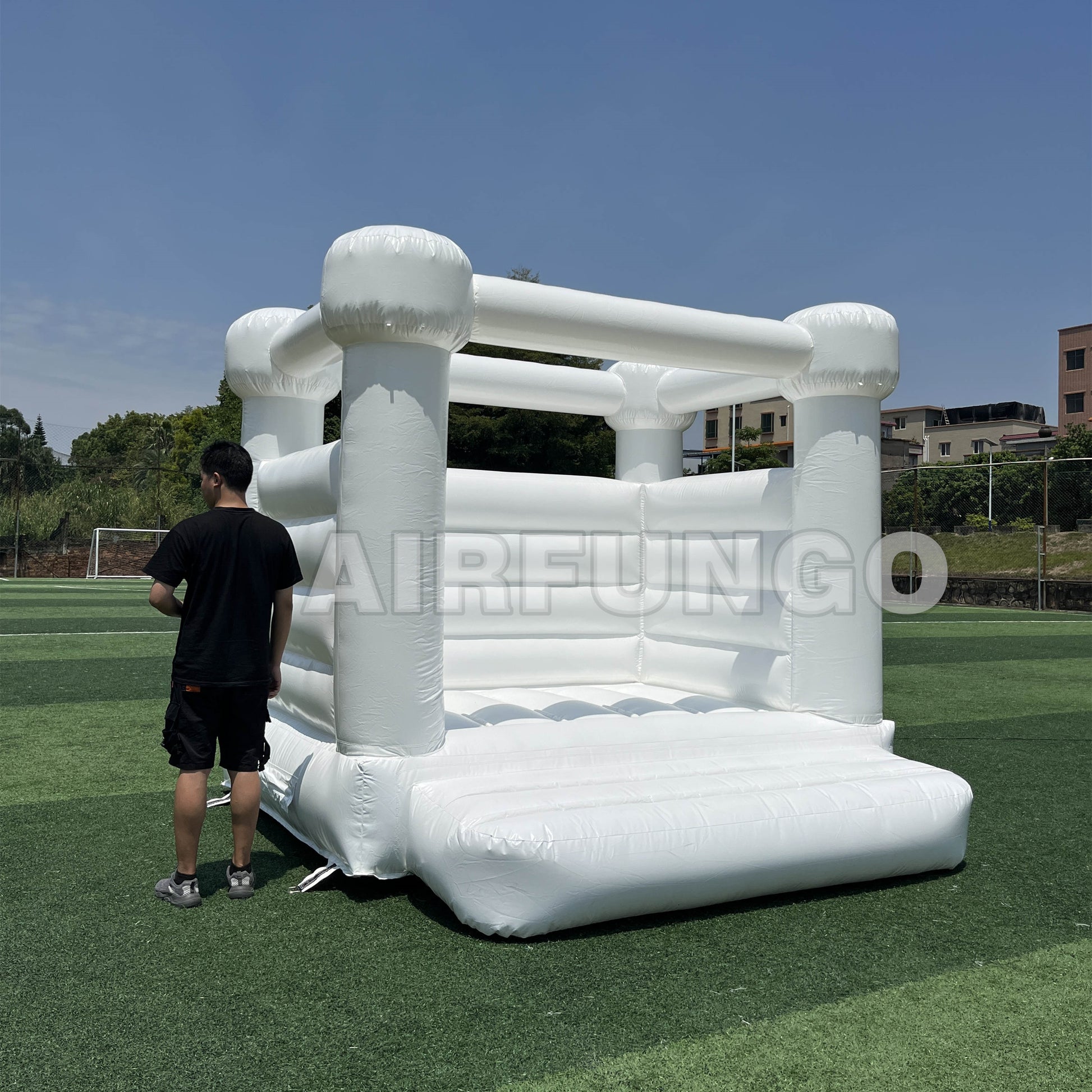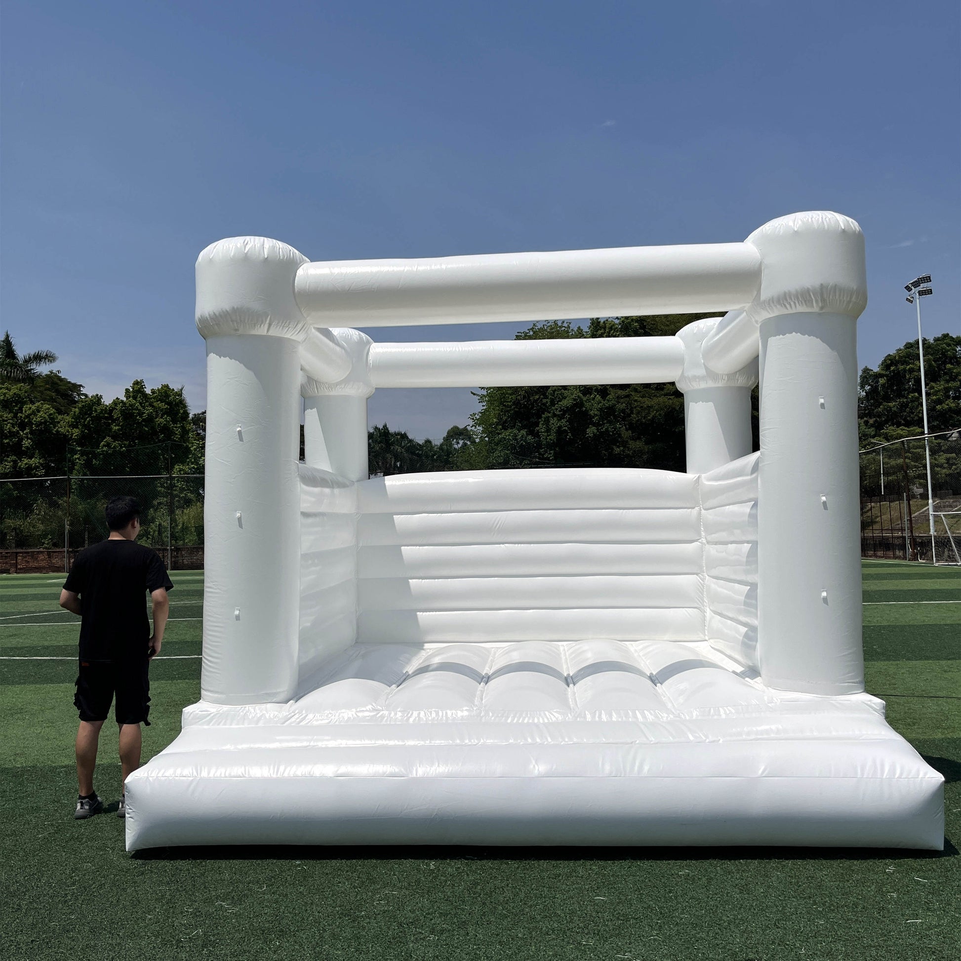- MATERIAL : The best material PVC tarpaulin, waterproof and UV resistant; Double seams everywhere; Every node is reinforced. The design of the D-ring makes it easy to install balloons and decorations. You can use your imagination to decorate this white jumping bed as you want.